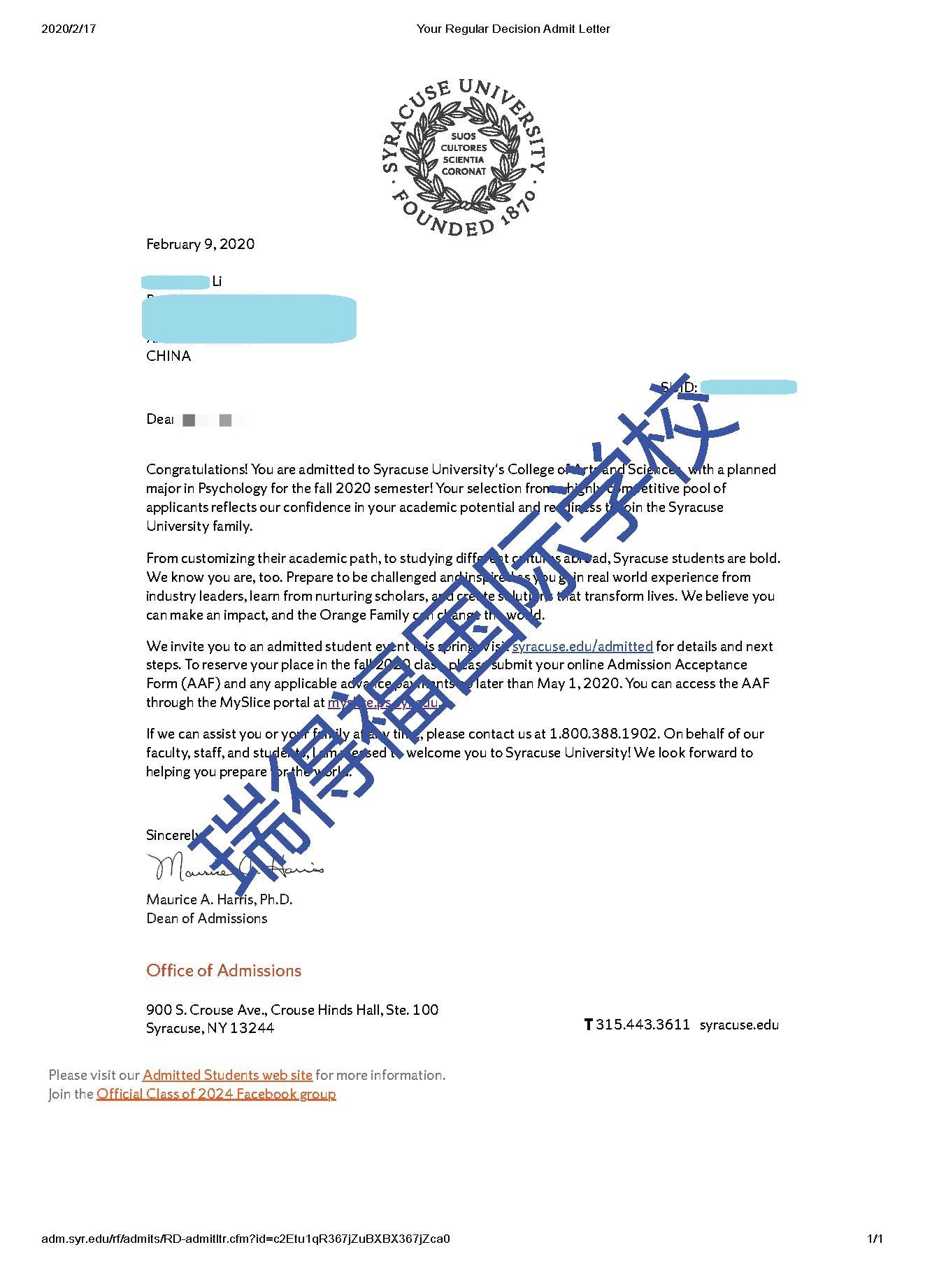 恭喜 【深圳瑞得福学校】Anderson李昌浩同学喜获全美TOP54大学-雪城大学Syracuse University的录取!